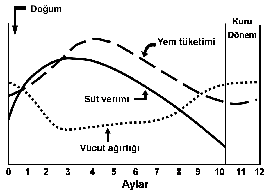 1. As can be seen in the chart below, the most important problem encountered after birth is that feed consumption in animals lags behind milk yield and tends to return to normal long after milk yield reaches its peak. Therefore, the rations to be prepared in the mentioned period should be intensified in terms of nutrient content. For example, energy-rich corn silage and protein-rich legume grasses should be preferred from roughage.